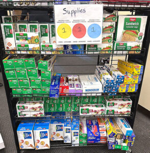 As the shoppers wait for White to call their numbers, he engages in small talk with the participants in both Spanish and English. “I get to know everyone, know their names, and I get to care about them; it’s very uplifting,” White states. Once inside, shoppers are given a cart and can pick what they need from the shelves based on family size. Each cart has a color-coded card. Shoppers can look at the signs above items and match the color of their card to the corresponding quantity. “Quantities can change based on inventory,” Yemoto Green explains, “This week, bread is unlimited.”