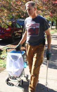 Minick, who has lived in Tigard for five years, and his partner Tami have always enjoyed walking, especially along Fanno Creek, “and I got tired of looking at the trash,” he said. “I first started taking along a bag to collect it and then got the cart and equipment.”