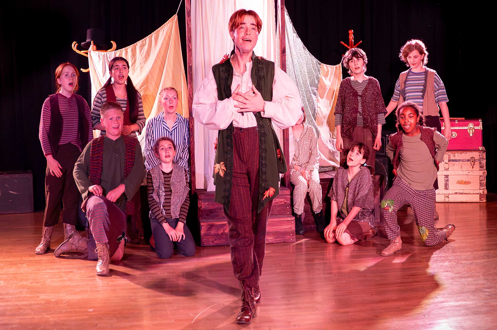 the Lost Boys at the Tigard Grange. The two-hour show, complete with a 15-minute intermission, featured impressive vocals and choreography while transporting 75 audience members to Neverland. Cheering, laughter, and applause from attendees were abundant at each show. Hunter Holt (Twality Middle School), cast as a Lost Boy, said, “My favorite part was how well all the adults and kids got along, it made the whole show really fun. We sang, danced, acted, worked with puppets, and even had someone come in to help with dialect. It was such a unique experience.”
