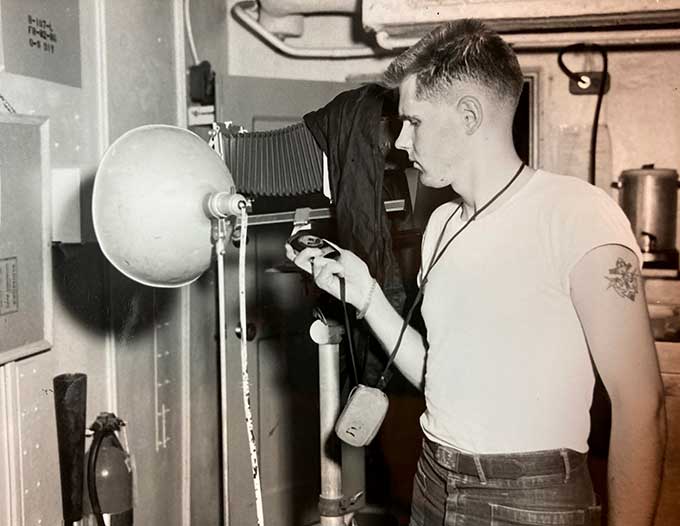 Ironically, he was only sent to U.S. Navy Photo School in Pensacola, Florida, four years after he first enlisted. Prior to that, however, he and his Princeton shipmates had a front row seat to one of the most spectacular sights that humans have ever seen – even if it came with apocalyptic overtones.