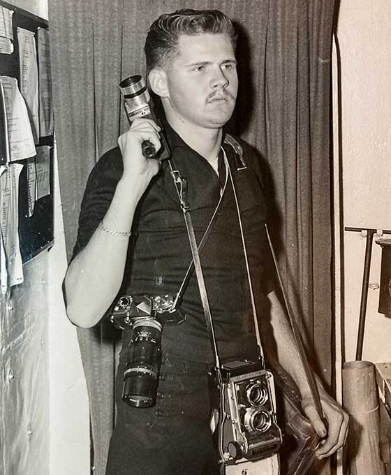 Larry Jensen holds up one of the five cameras he will take with him on a photo reconnaissance flight.