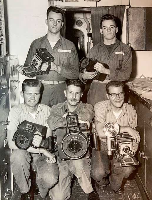 The five photographers of the USS Princeton’s photo crew pose for a group shot. Larry Jensen is at bottom left.