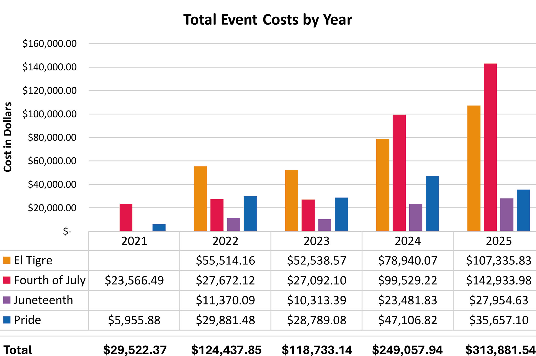 A graph presented at the Oct. 21 city council meeting illustrated year-over-year costs for city events such as El Tigre-Fest, Juneteenth, Pride and the Fourth of July. The total price of all four events has increased by more than $250,000 since 2021.