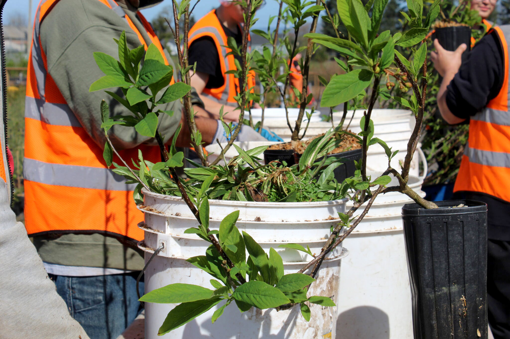 Several youth spend their mornings pulling weeds from nursery pots filled with red currants, snowberries and other native shrubs. On some days, they focus on sowing seeds or transplanting seedlings into larger pots.