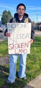 Miguel Hernandez, a Junior at Tigard High School, held up a sign that read “NO ONE IS ILLEGAL ON STOLEN LAND” and explained that he was specifically protesting ICE’s increased presence in the area.